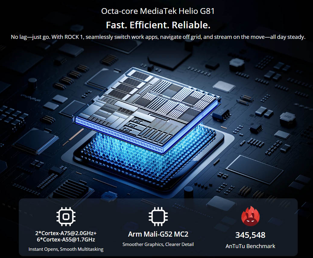 ▼Blackview ROCK 1が搭載するSoCはHelio G81。メモリは8GB、ストレージは256GBです。↓