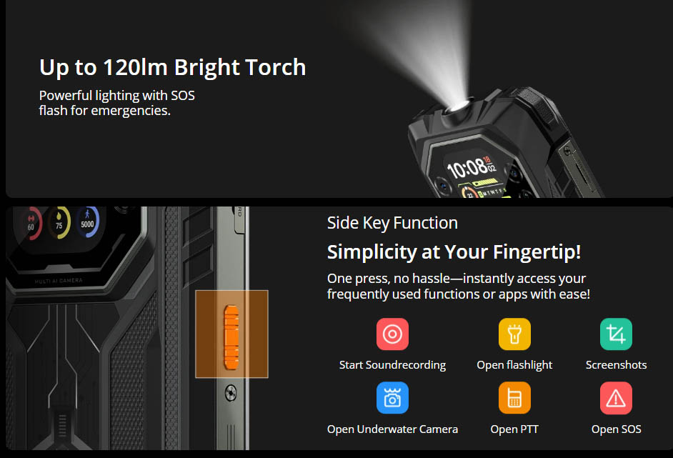 高い耐久性に加え、ショートカットキー、ライト、背面ディスプレイ等の面白い機能を搭載していますが、SoC、ディスプレイ、カメラなどのメイン性能は最低レベルになっています。