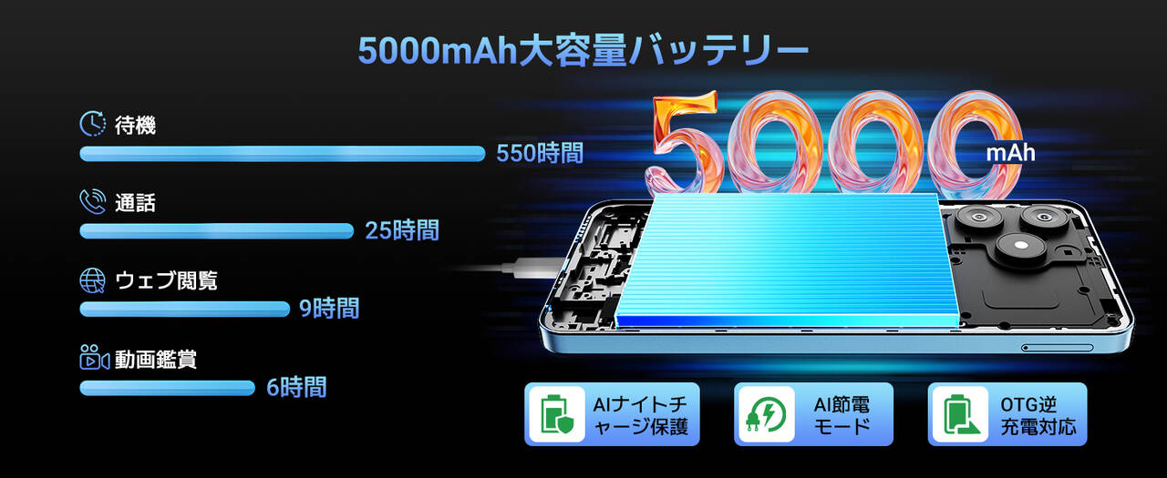 ▼バッテリー容量は5,000mAh!格安ながらバッテリー容量があるのがいいですね。WEBで9時間、動画視聴で6時間ほどの電池持ちとのこと。↓