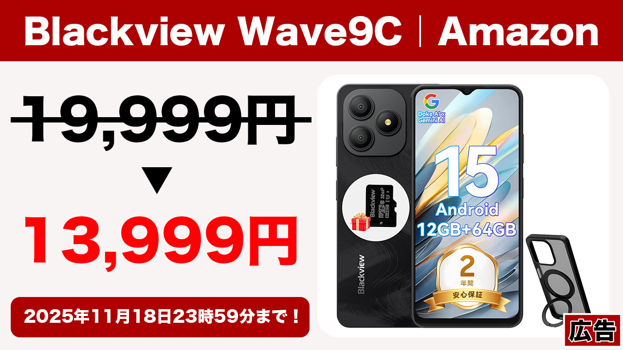 Blackview Wave9CがAmazonセールで1.4万円弱とかなり安くなっています。今回のモデルはかなりローエンド寄りなスペックになっており、メインではなくサブスマホ向けという点は留意が必要です。