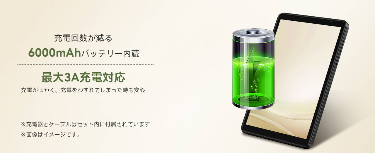▼バッテリーは結構デカ目な6000mAhを搭載。充電は3A対応とのことなのでおそらく15Wまででしょう。画面解像度の低さも相まって電池持ちはなかなか期待できるスペック。↓