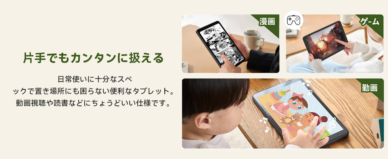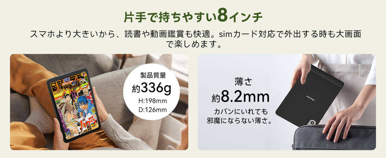 ▼本機の特色といえばこの小ささ!8インチサイズ‥長辺は198mm、短辺は126mmとコンパクト。重さも336gで、スマホよりデカイ画面を楽しめるタブレットとしては結構持ち運びやすいんです。↓