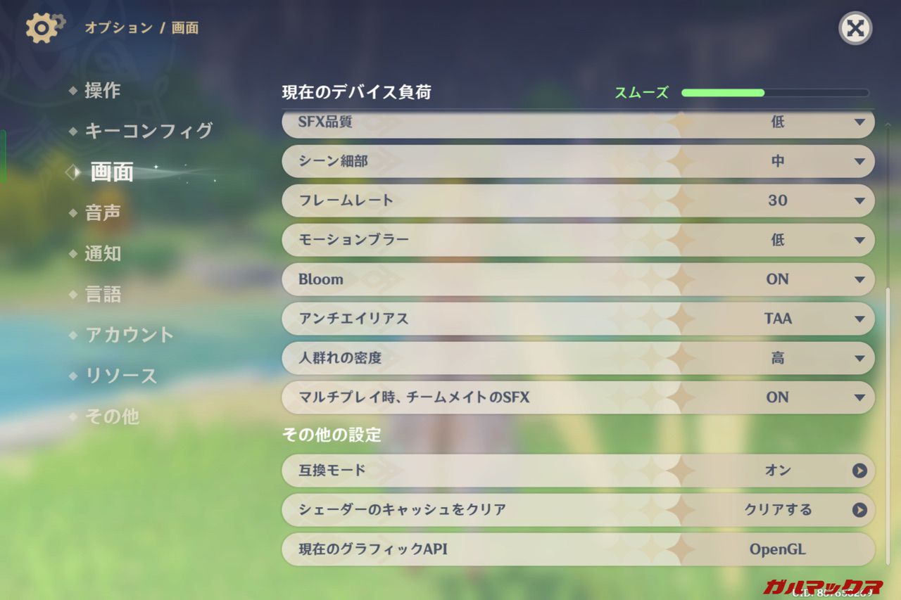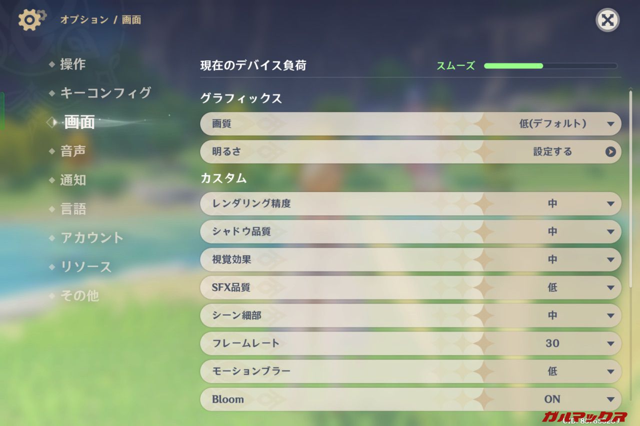 ▼グラフィックのデフォルト設定は「低」となっていました。↓