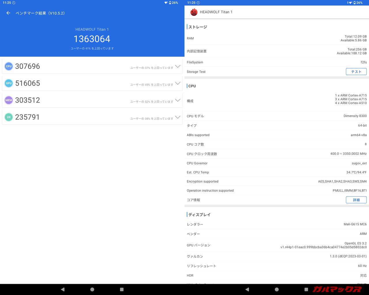 ▼参考にAnTuTu(V10)のスコアは総合スコアが1,363,064点、GPUスコアは516,065点、UXは235,791点です。↓