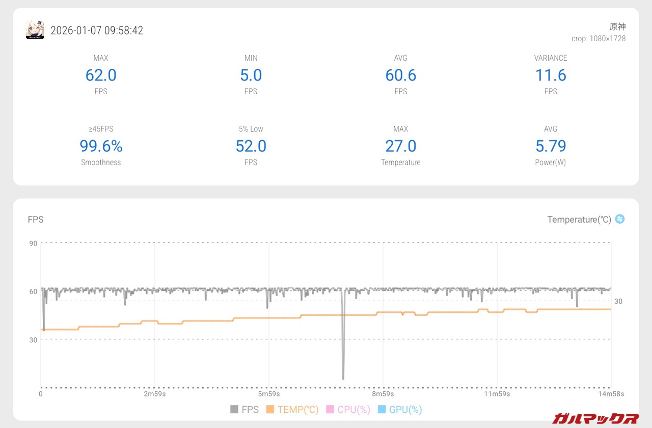 約15分のプレイで消費電力は5.79Wとワッパはそれほど良くは無いのでバッテリーの減りは早く感じるかもしれません。