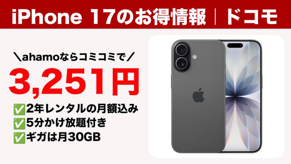 ドコモがiPhone 17の2年レンタルをさらに値下げ!ahamoなら月30GBと5分無料通話つきでコミコミ3,251円