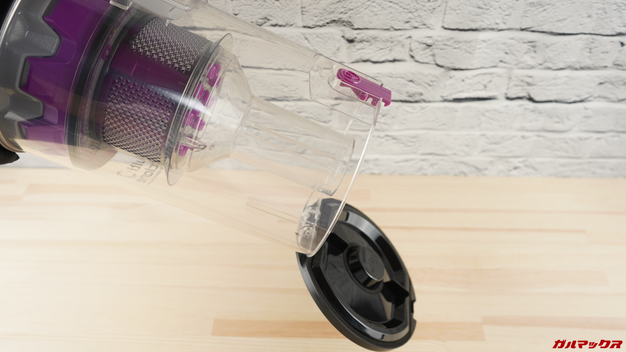 ▼ごみ捨てもサイクロン式スティック掃除機とほぼ一緒。ダストカップをスッポンと抜いて・・・↓