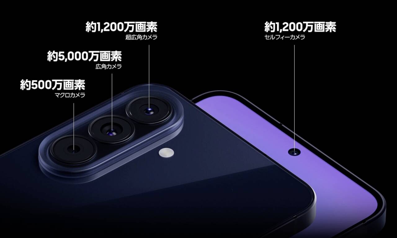カメラは5,000万画素のメインカメラ、広い範囲を撮影できる1,200万画素の超広角カメラ、接写を楽しめる500万画素のマクロカメラの3カメラ構成となってます。ミドルらしい組み合わせ!