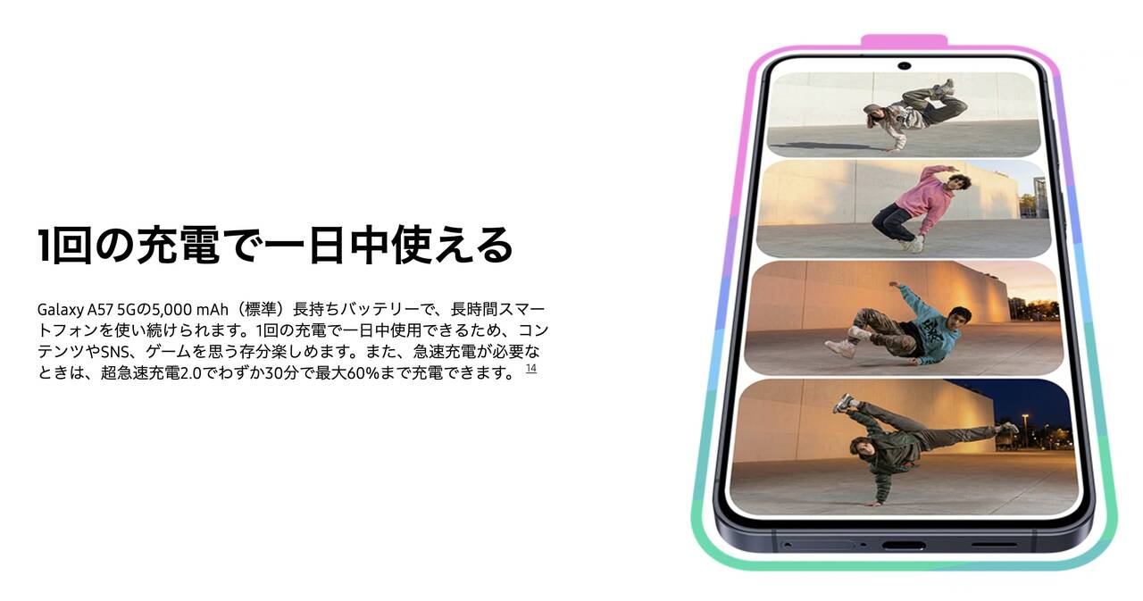 Galaxy A57 5Gのバッテリー関連をチェック