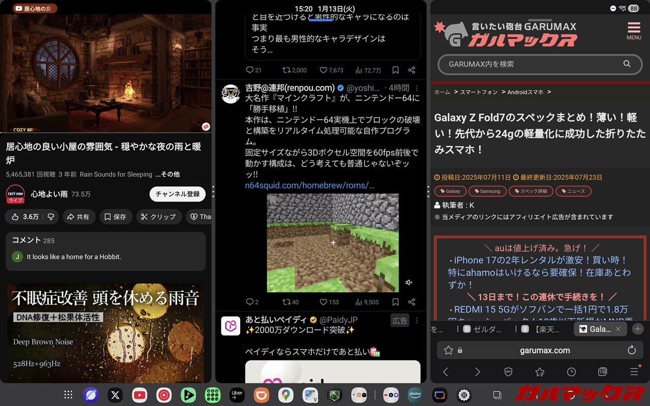 ▼あと少し前のアプデで「真横に3つアプリを並べるスタイル」の画面分割表示ができるようになったんですが、この3つ同時起動の状態でも高リフレッシュレートを維持して快適になっているのも嬉しい。↓