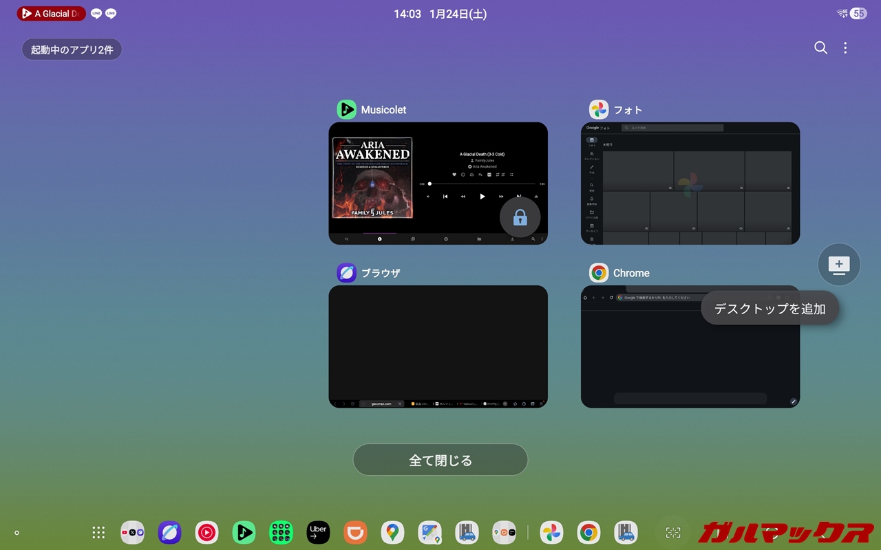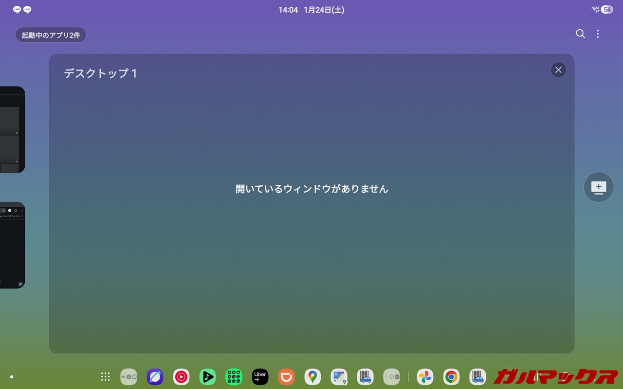 ▼Dexのようにモード自体が切り替わるのではなく、デスクトップというグループが追加され、その中のアプリだけがPC風の挙動になります。ここから別にアプリを引っ張れば、従来の動作に戻せる柔軟性の高いタイプ。↓