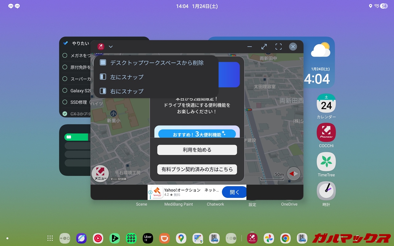 筆者はよく「音楽アプリ」「SNS」「ブラウザ」を並べ、必要に応じ「ポップアップでナビアプリ起動」という使い方をしている超ヘビーユーザー。