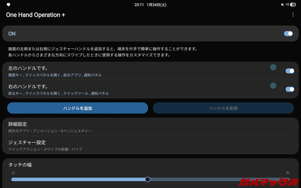 ▼拡張機能を追加するGood Lockも優秀。特に片手操作がラクになるOne Hand Operation。これはタスクバーと3ボタン方式のナビバーがある状態でもスワイプジェスチャーができるようになります。ジェスチャーに応じた機能の細かい指定も対応。↓