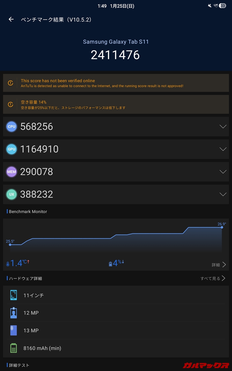 Galaxy Tab S11のスペック、ベンチマーク、検証結果