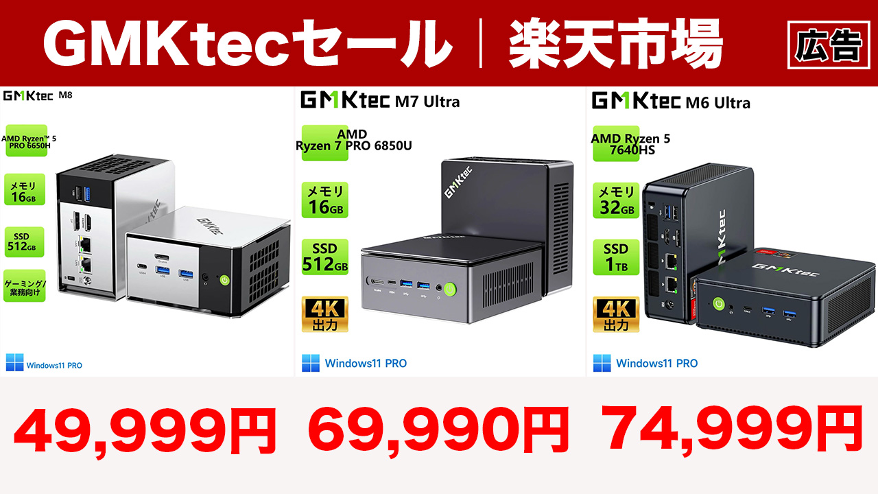 こっちは楽天市場!GMKtecミニPC「M8」「M7 Ultra」「M6 Ultra」が割引中!3月26日まで!