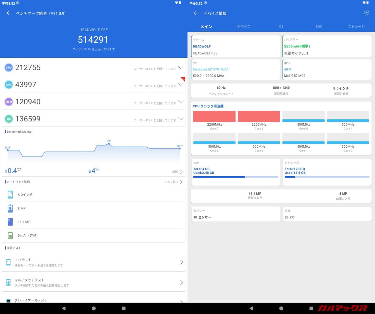 という訳でHeadwolf F6Eはメモリは4GBでストレージもしっかり128GB使えるのでご安心を。