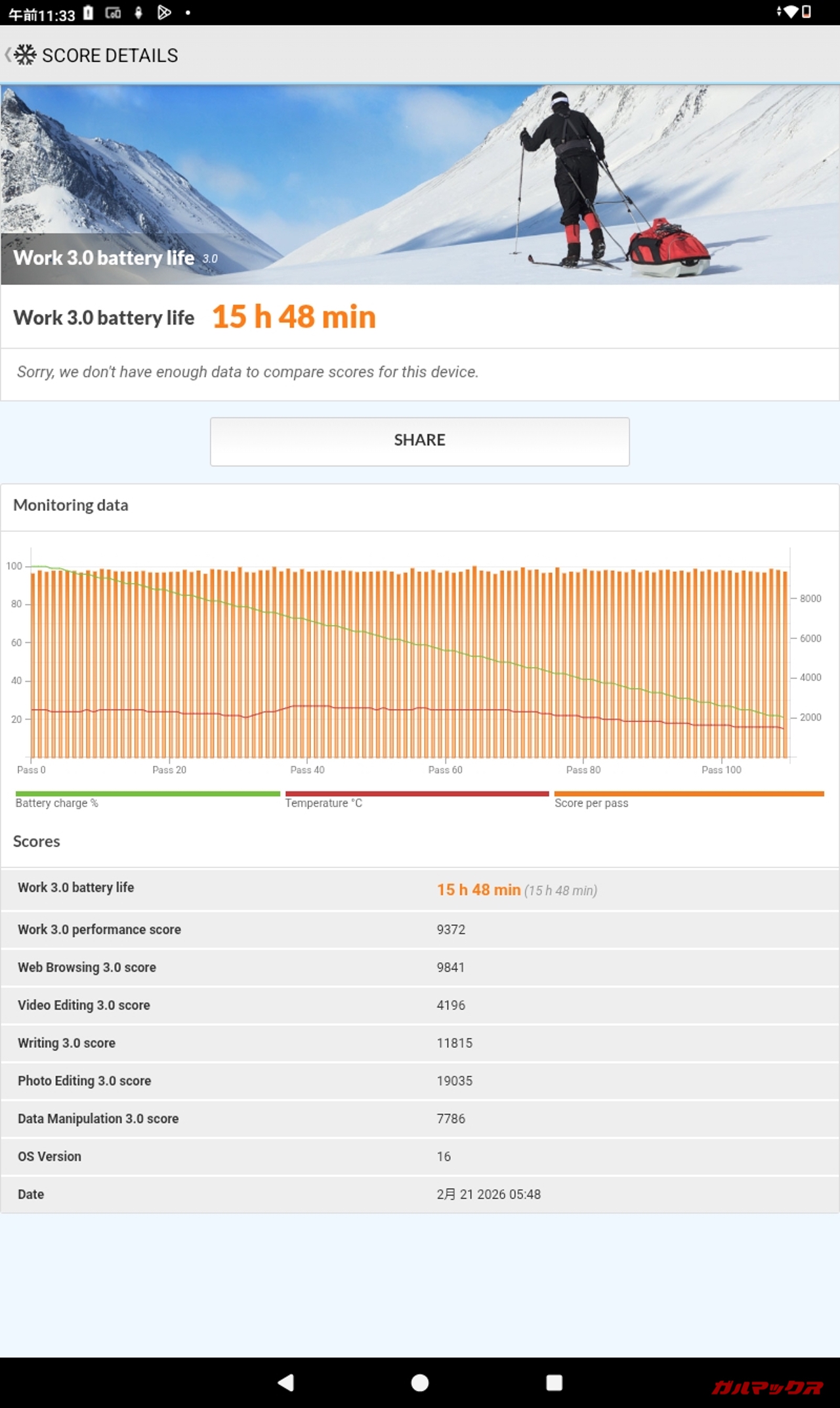 ▼バッテリー持ち検証は以下の通り。輝度110luxで100%→20%までの駆動時間は15時間48分。十分。↓