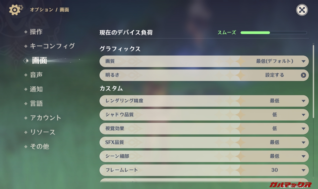 ▼一応、原神も入れてみた。デフォルトの画質設定は「最低」となっていた。動かしてみると全く快適ではない。↓