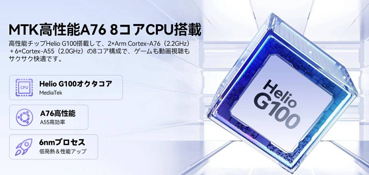 ▼搭載SoCはMediaTek Helio G100を採用しています。↓