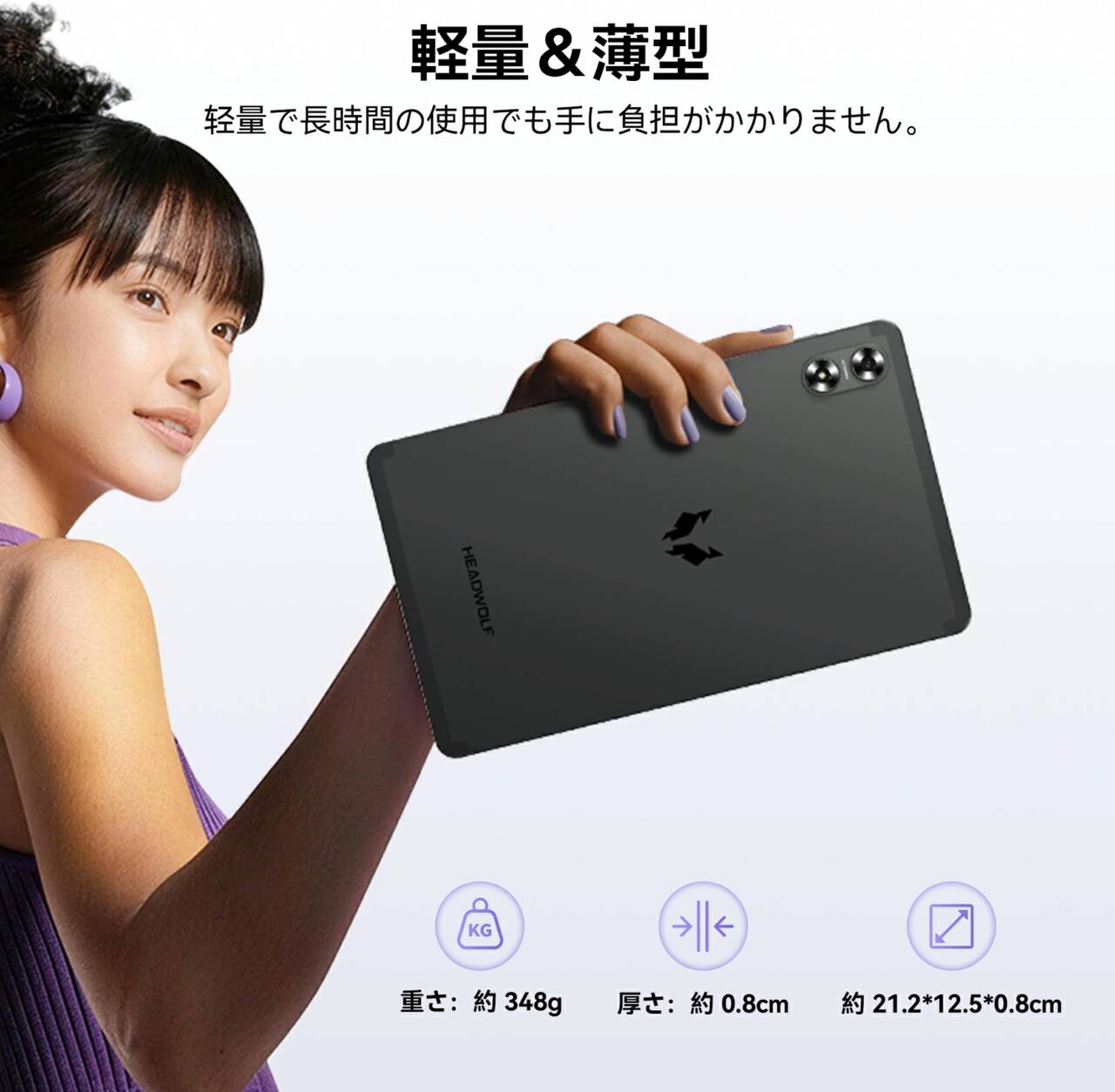 ▼画面サイズは8.7インチで厚さは8mm、重量は約348gとなっています。↓