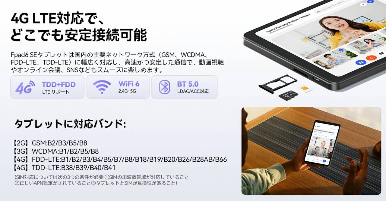 | ネットワーク | Wi-Fi 5 / Bluetooth 5.2 / 4G LTE対応(SIMフリー) |