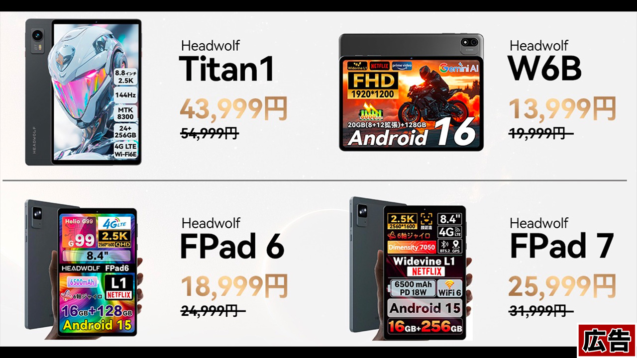 HEADWOLFがTitan1、FPad 7、FPad 6、W6Bを割引中。今回は楽天市場でのセールなので楽天経済圏の人向き。また今回はレビューキャンペーンも開催しているとのこと。内容に関わらずレビューした人はもれなくケースが貰えるそうなので購入検討中の人はチェックしてほしい。