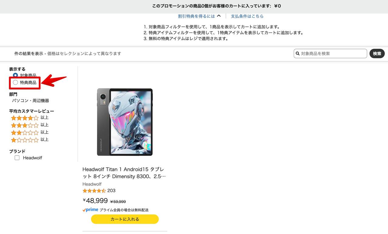 ▼画面が切り替わったら「特典商品」を選ぶ。↓