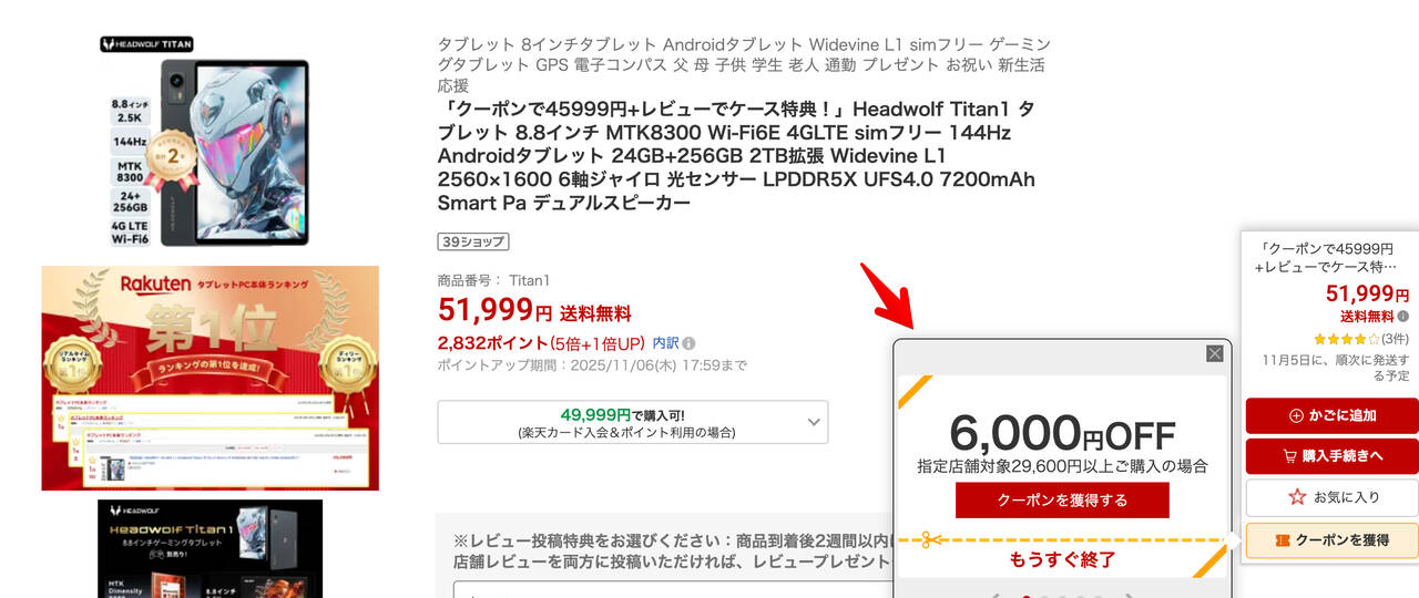 セール内容としては、端末価格が51,999円のところ楽天市場のページに記載されている6,000円オフクーポンを適用することで45,999円の割引価格で購入できます。