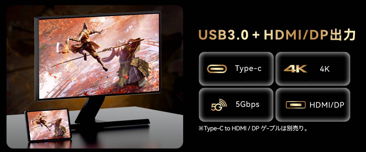 ▼また外部ディスプレイとの接続もできるので、大画面+コントローラーを使ったゲームのプレイや大画面での動画視聴もいけます。(画像をよく見るとゲープルって書いていてフフッとなりました。このあたりはご愛嬌)↓