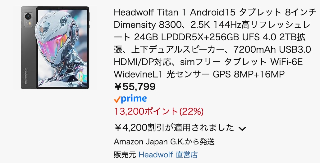 12/18まで実質42,599円!8型タブレットのHeadwolf Titan 1が大量PT還元+クーポン割引中