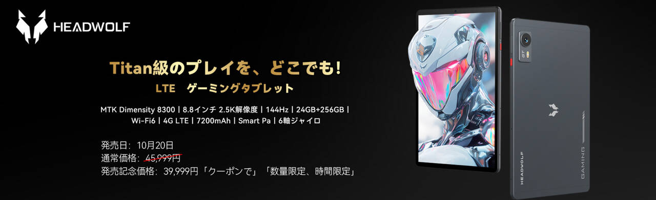 Headwolfから8.8インチのDimensity 8300を搭載するゲーミングタブレット「Headwolf Titan 1」が登場。楽天市場に製品ページが公開されていたので、早速スペックをチェックしていきます。