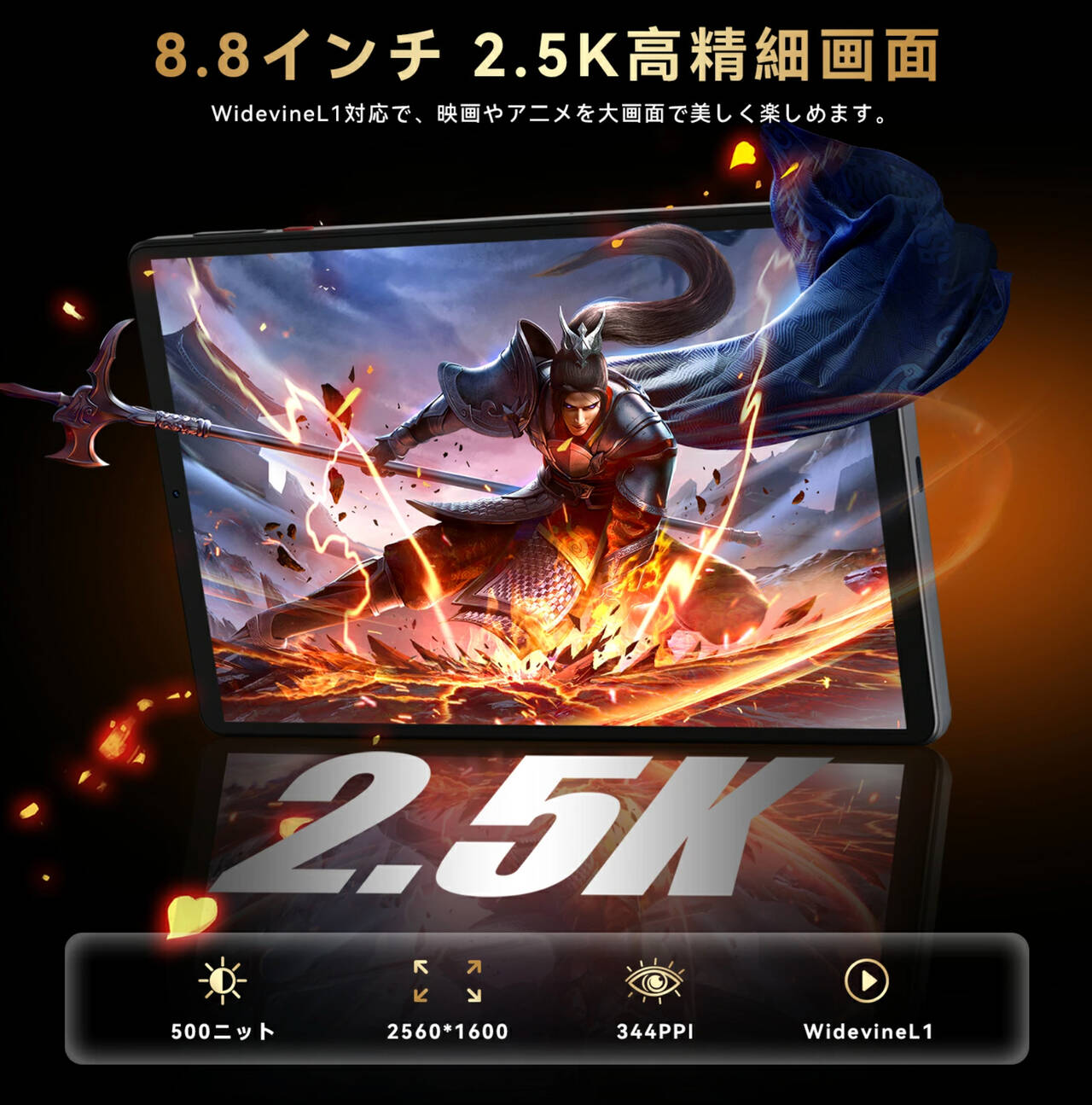 ディスプレイは上述した通り8.8インチを採用。解像度はなんと2.5Kの2,560×1,600で画素密度は300ppi超えの343ppiと高精細。かなりリッチ。