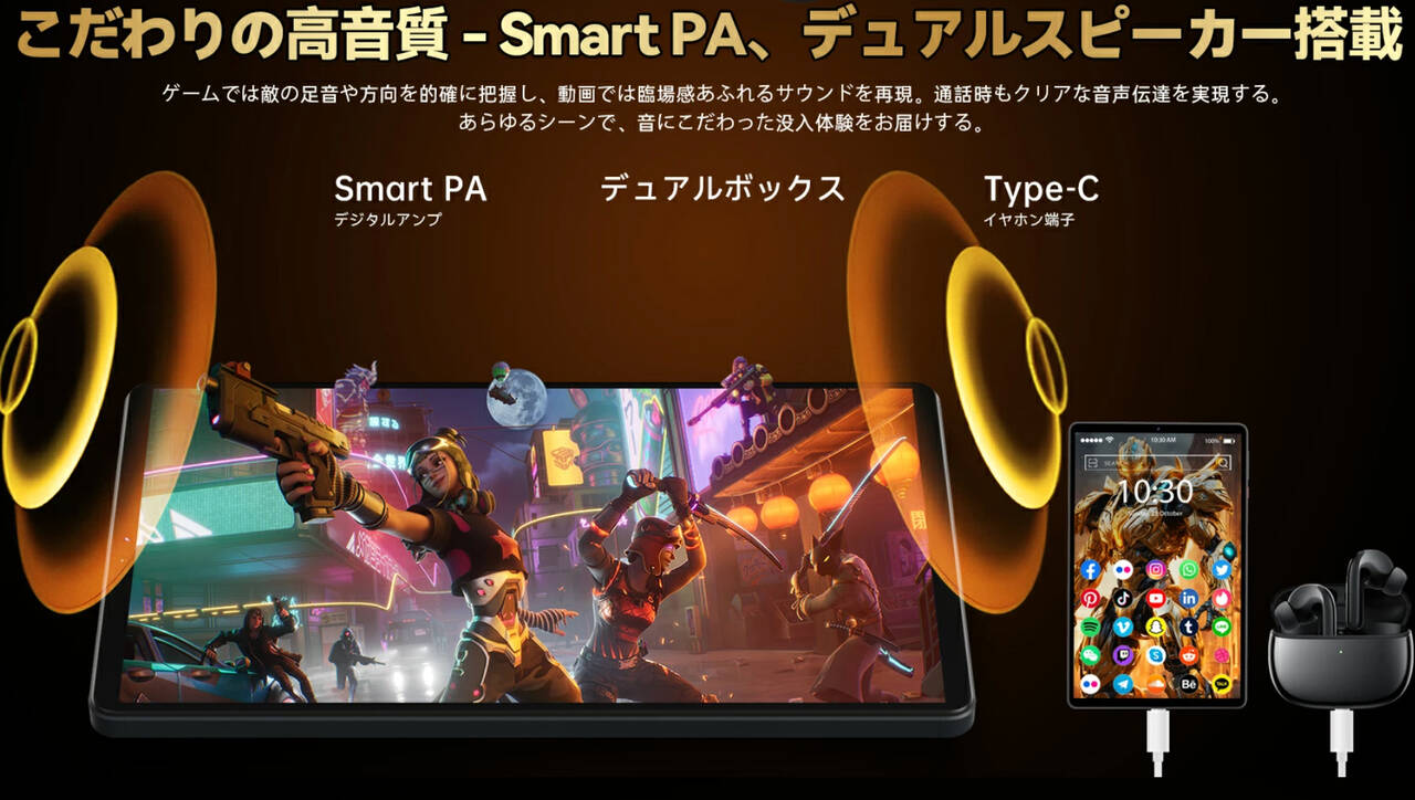 大人気モデルのHeadwolf FPad7/7Proもステレオでしたが、あっちは縦持ちでステレオの配置。横持ちゲームや大画面での動画視聴で音の偏りが気になったので、この変化は嬉しい方も多そう。