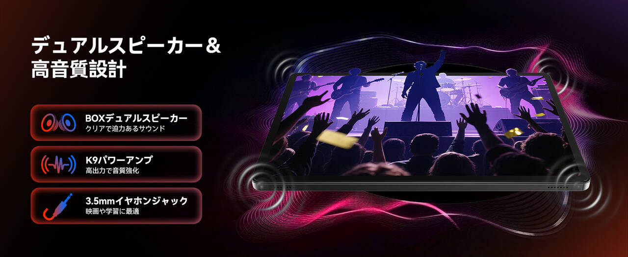 ▼スピーカーはK9パワーアンプを搭載するBOXデュアルスピーカーを搭載!便利なイヤホンジャックもしっかり備えています。↓
