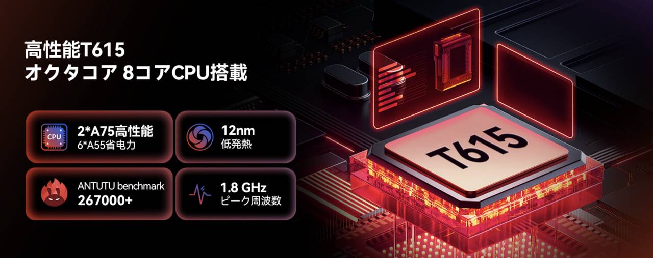 ▼搭載するSoCはローエンド帯のUnisoc T615!メモリは4GBでストレージは128GB。(メモリ24GBは4GB+仮想メモリ20GBの合算なのでご留意を)↓
