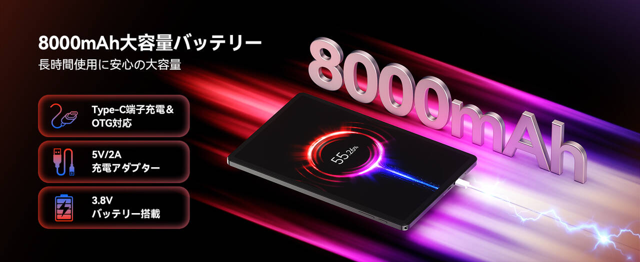 ▼バッテリー容量は8,000mAhを搭載。充電は10W。↓