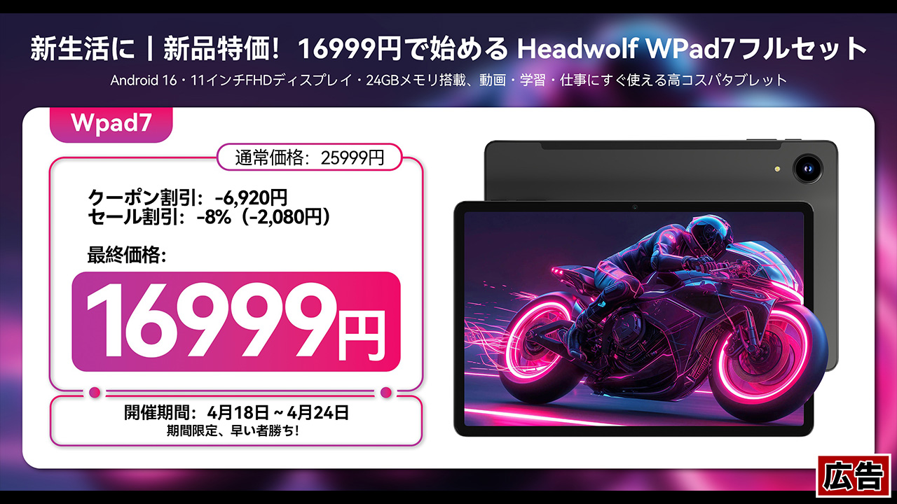 4月24日まで!11型タブレット「Headwolf WPad7」が16,999円!豪華アクセサリー7点セット