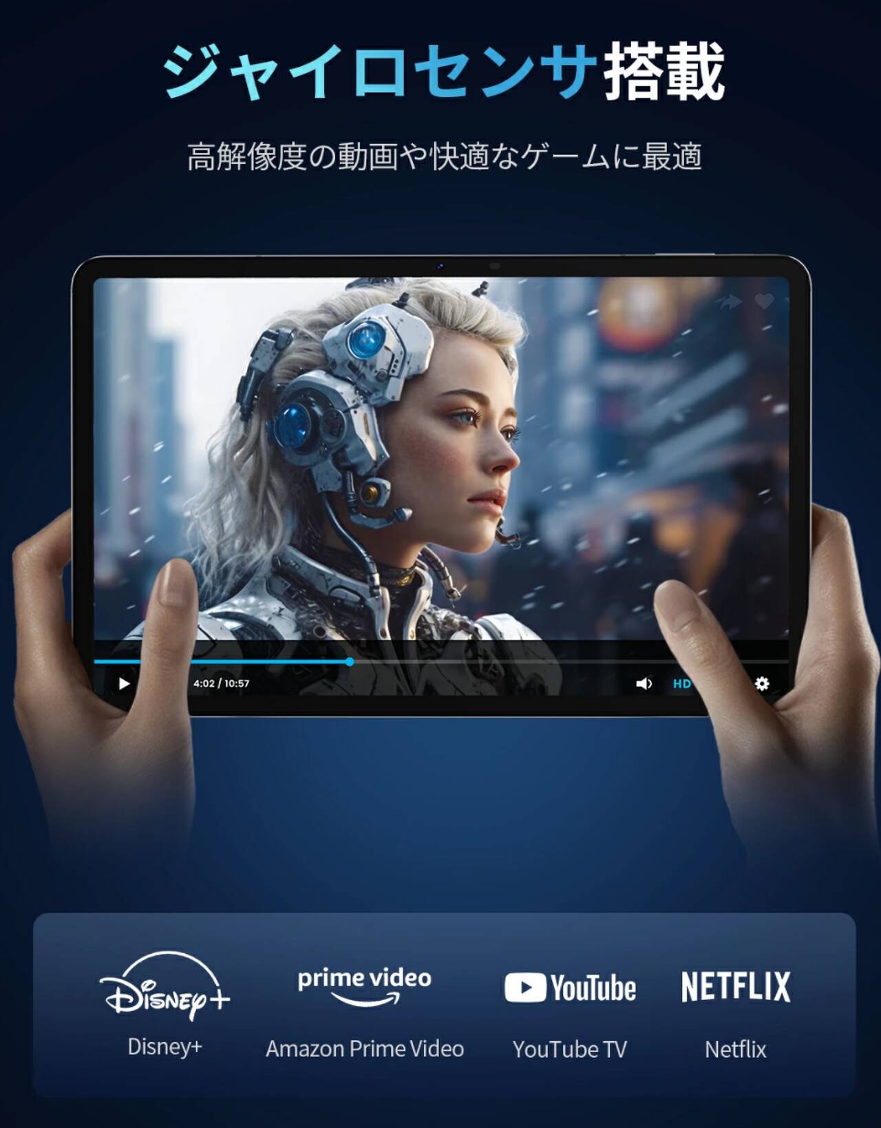 ▼そうそう、ディスプレイの項目でいきなり「ジャイロセンサ搭載」とアピールされていた。その下にはストリーミングサービスのロゴとテキストが。WidevineのPRかも知れないが記載は無い。作りが適当過ぎて謎は深まるばかり。↓