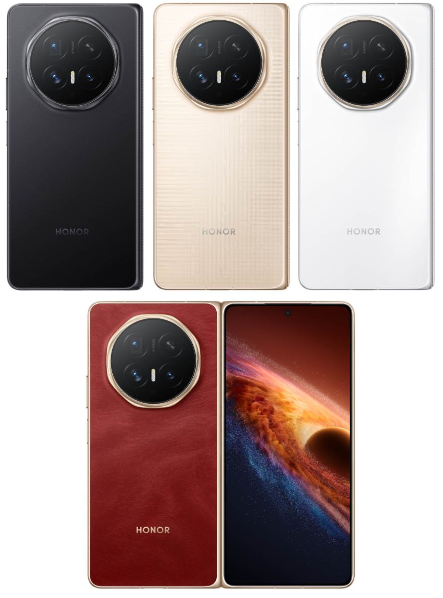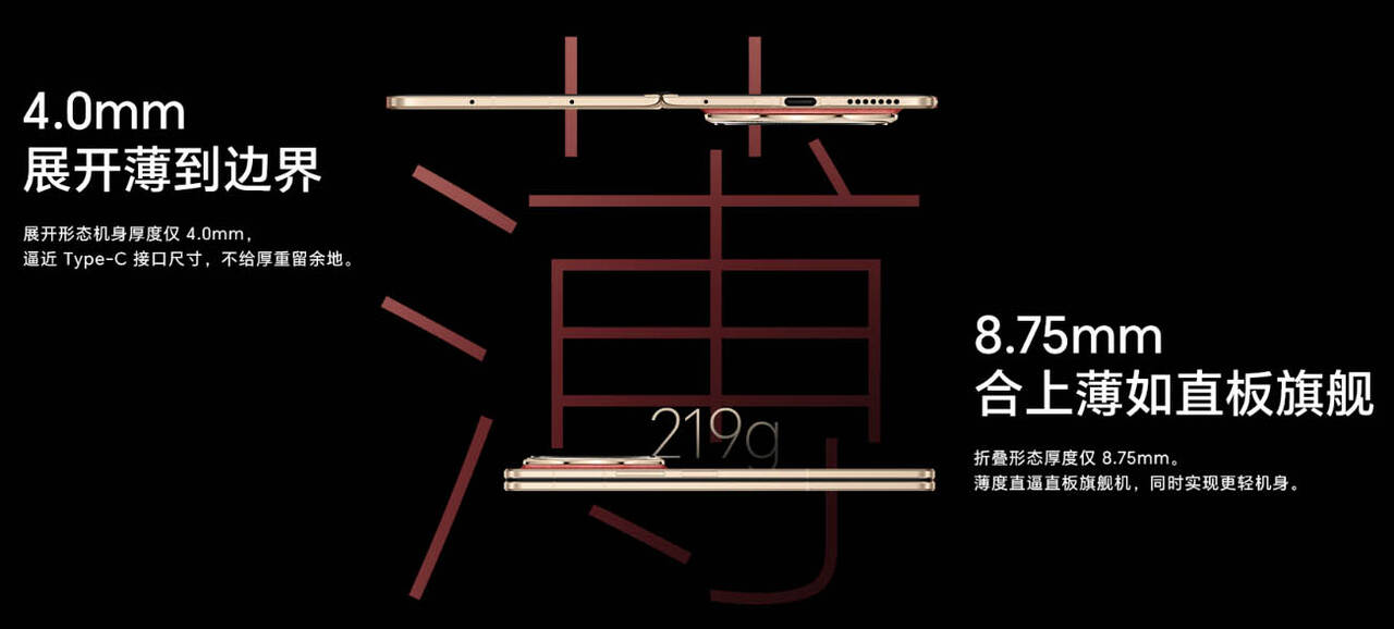 折りたたみ時のサイズは、156.7×74.5×8.75mm(雪域白)、156.7×74.5×9mm(赤兔红、旭日金、绒黑色)。