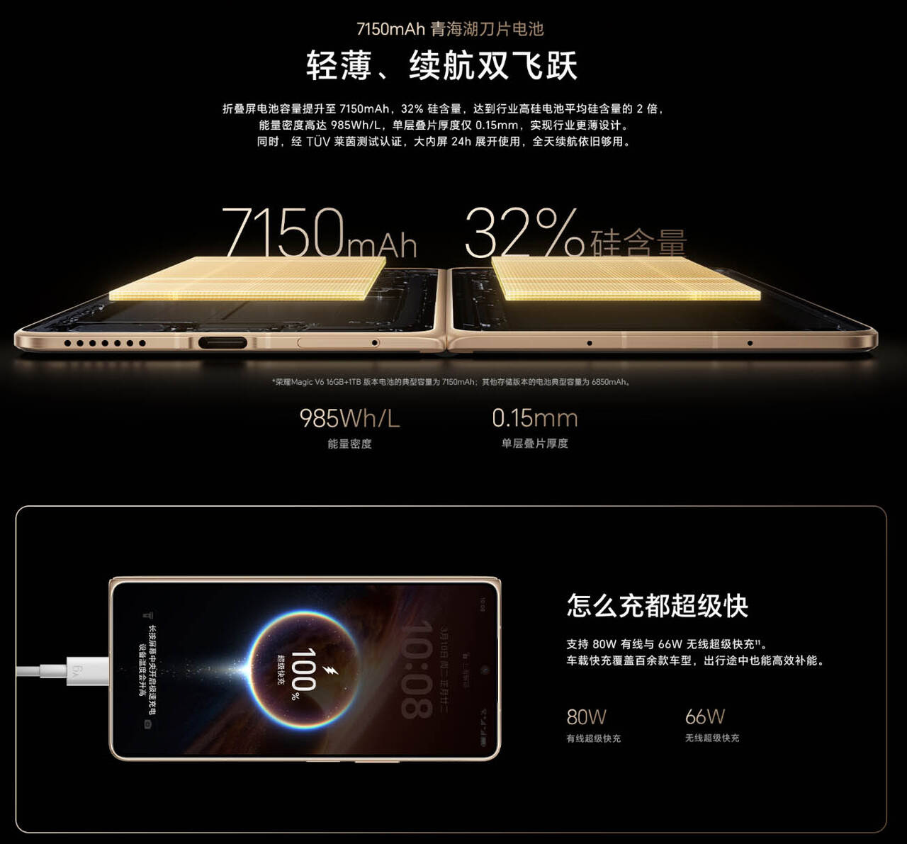 ▼バッテリーはなんと最大7,150mAh!(16GB+1TBモデルのみ7,150mAh、それ以外は6,850mAh)。80W(Honor SuperCharge)の有線充電と、66W(Honor SuperCharge)のワイヤレス充電に対応しています。↓