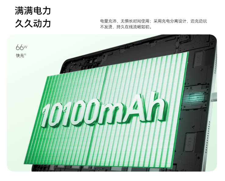 ▼バッテリー容量は10100mAh。66W(SuperCharge)の急速充電に対応しており、約73分でフル充電が可能だそう。↓