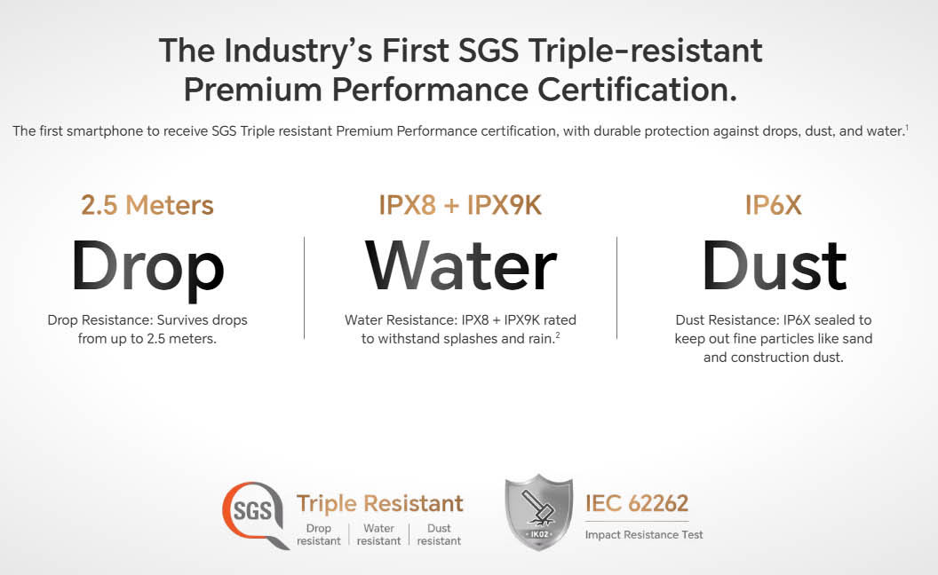 ▼IP6Xレベルの防塵耐性、IPX6、IPX8、IPX9Kの防水耐性、2.5mからの落下に耐えることができるレベルの衝撃耐性があります。↓