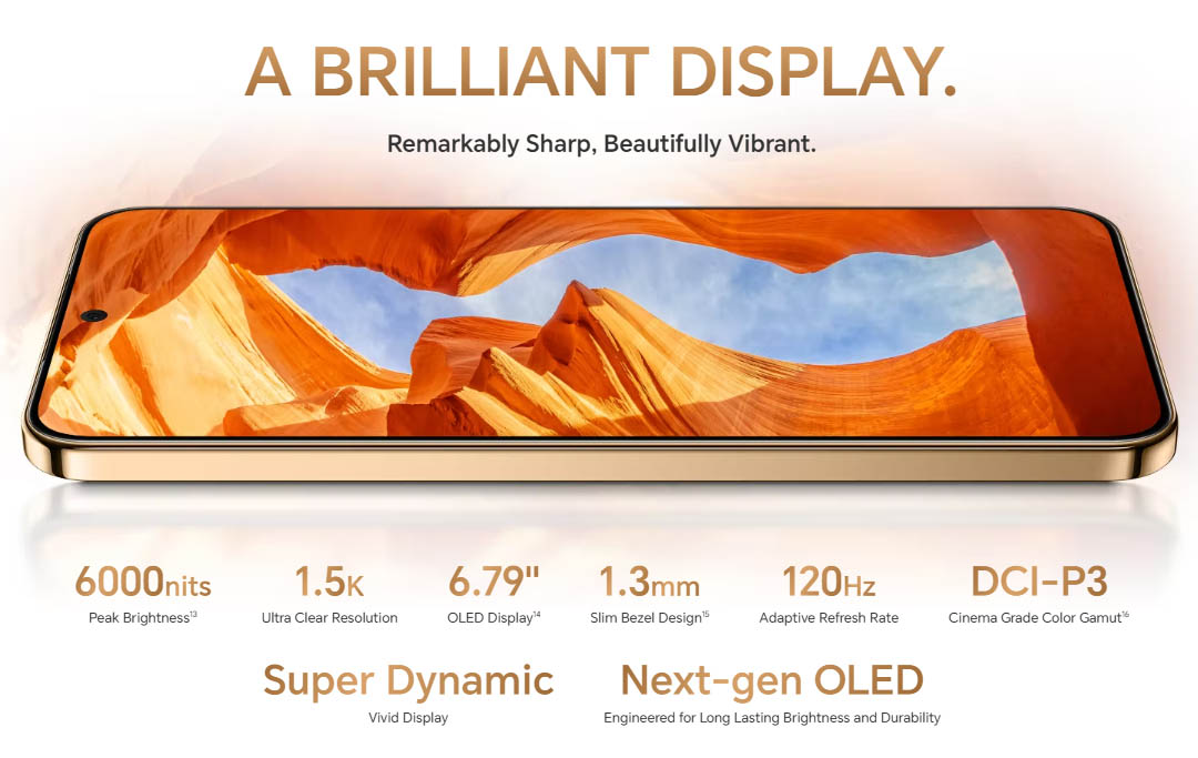▼ディスプレイは6.79インチの有機EL。解像度は2640×1200、リフレッシュレートは最大120Hzで、ピーク輝度は6000nitsに達します。ベゼルは1.3mmとミドルレンジとしては優秀。↓