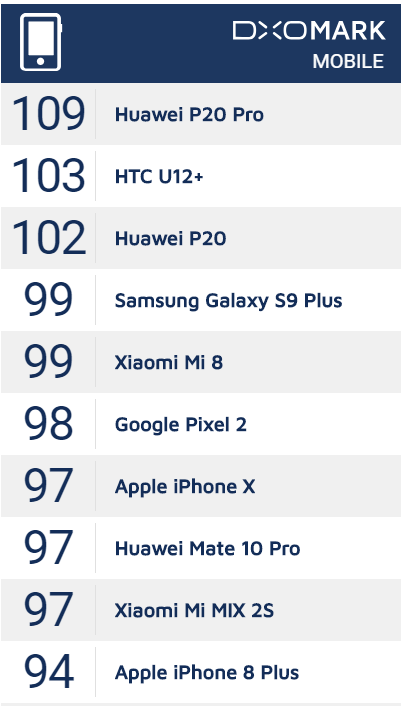 ▼HTC U12+のカメラはDxOMarkのモバイル部門で103点の高評価を得たモデルです。執筆時次点ではHuawei P20 Proに次ぐ2位となっています。↓