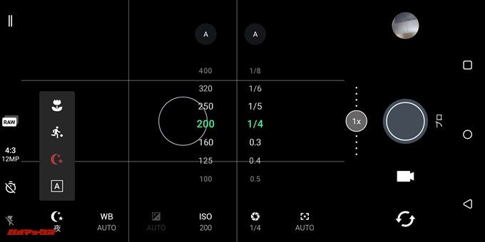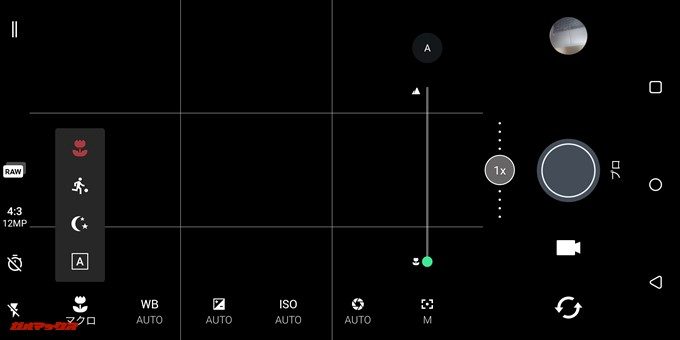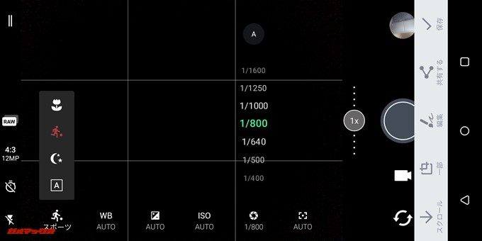 - 撮影モードは接写、スポーツ、夜景、オートに分かれており、オート以外は設定するマニュアル項目が表示されます(後述)