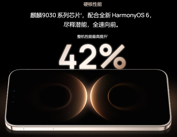 ▼SoCには新登場のKirin 9030 / Kirin 9030 Proを搭載(※12GBモデルはKirin 9030、16GBモデルはKirin 9030 Pro)。先代のMate 70 Pro(SoCはKirin 9020)から42%の性能アップとのこと。↓