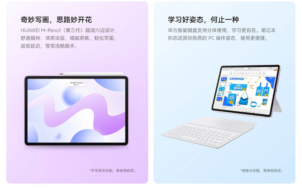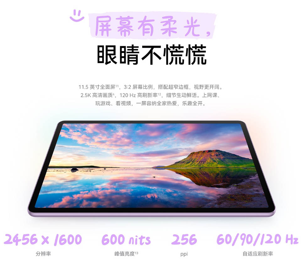 ▼カラーは羽砂紫(パープル系)、海岛蓝(ブルー系)、冰霜银(シルバー系)、深空灰(グレー系)の4色。サイズは177.5×262.6×6.1mm、重量は515gと薄型軽量です。全网通対応版のみ6.8mm、573gになっています。↓