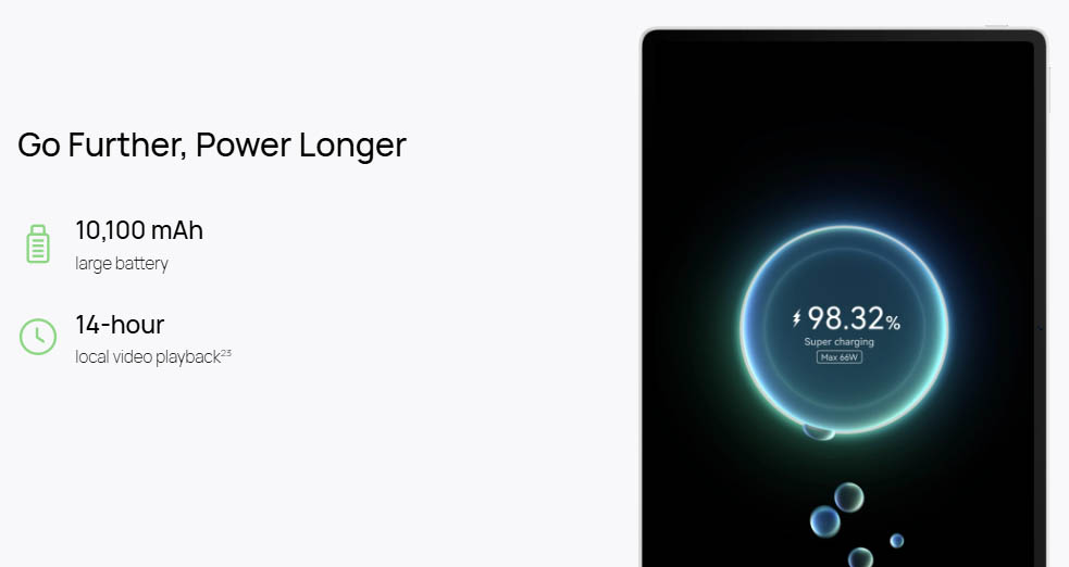▼バッテリー容量は10100mAhで、14時間の連続動画視聴が可能とのこと。66W(SuperCharge)の急速充電に対応しています。↓