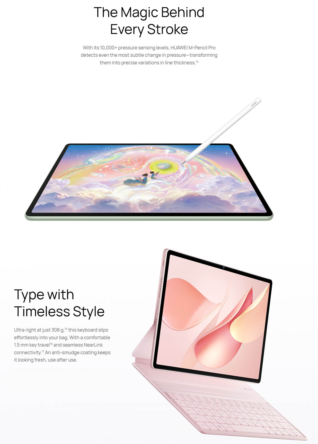 ▼もちろんスタイラスペン(HUAWEI M-Pencil Pro、別売り)やキーボード(同梱)も用意されています。キーボード同梱は嬉しいですね!買ってすぐフルセットで使えます。↓