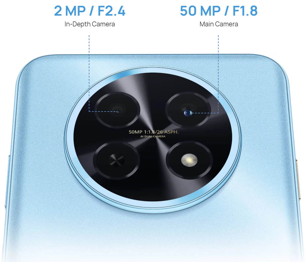 ▼リアカメラの構成はは50MP(広角、f/1.8)+2MP(深度)。深度カメラはあくまで補助的なものに過ぎないので、実質シングルカメラ構成です。フロントカメラは8MPです。どちらも最低限の構成ですので、記録用程度と思っておくとよいでしょう。↓